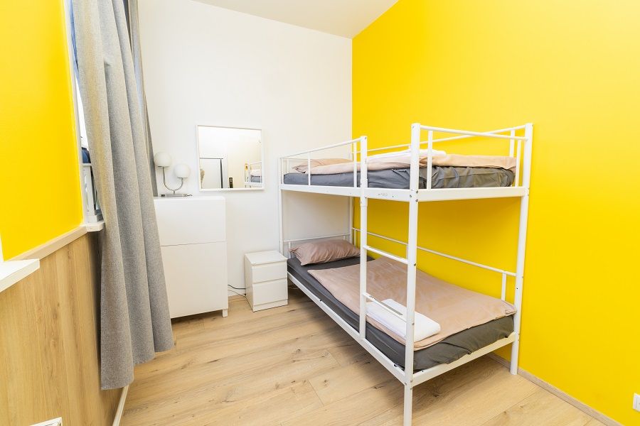 The room features two bunk beds, accommodating up to four guests. Each guest will have access to a coat hanger and shoe rack for their belongings. The room is designed to provide both comfort and convenience. Whether you're here to relax or meet new people, this room ensures a pleasant stay.